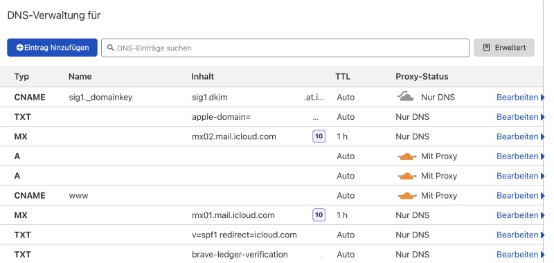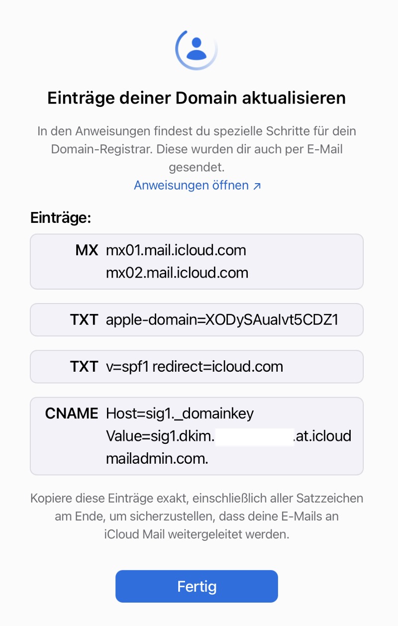 The values itself are quite lucid — two MX-, two TXT and one CNAME-entry is all you need to finally connect your iCloud-account with your custom-domain.