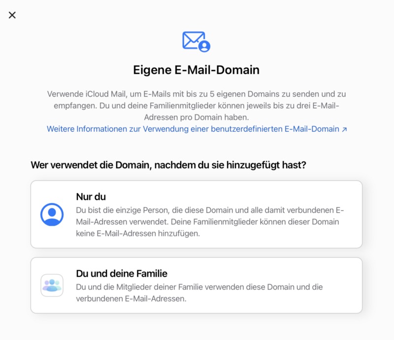 After checking that you’re on a paid iCloud-subscription, first of all login and go to your account settings on beta.icloud.com. Under the list of your configured and activated devices, you will find the „Hide-my-E-Mail-address“-feature and — just below — the long-expected option for enabling custom E-Mail-domains. After clicking here, you have the option to wether configure the whole E-Mail-domain just for your own use (including all addresses) or if you want to share E-Mail-addresses with your family plan so that the members here may also benefit from the new iCloud-feature. In my case, I opted for the family. iCloud Mail supports up to five own domains with three addresses per domain on each family member which seems enough in my personal scenario here!