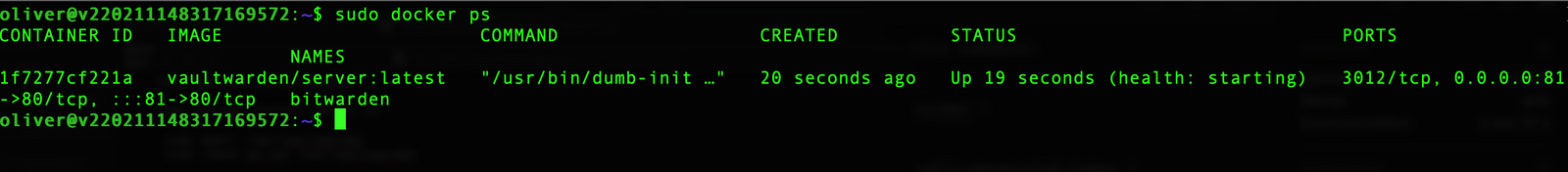 I went with port 81 here so that it won’t collide with a possible different web service running on port 80 sooner or later - which is still the internal port in the container. The parameters are quite self-explaining here and especially the „—restart=always“-option takes care of starting the Vaultwarden-container each time you restart the underlying host.