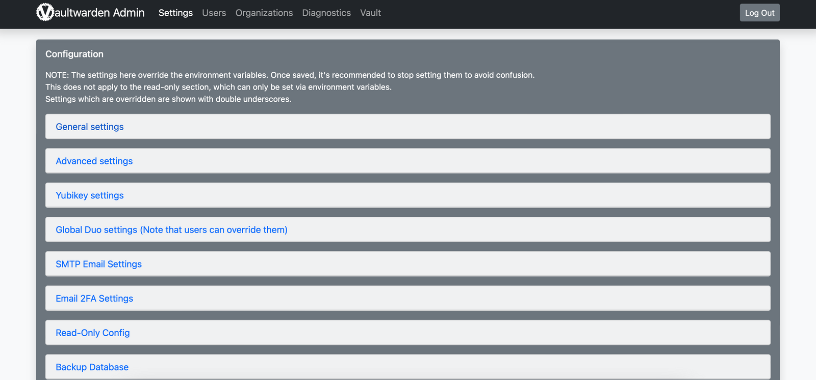 To achieve this, head to https://vaultwarden.domain.tld/admin and enter the secure token you have created some steps earlier. You will the be redirected to a quite simple looking backend where you can configure all basic parameters including E-Mail-notifications sent via a smarthost, YubiKey-integration or the possibility of creating a backup of your vault.